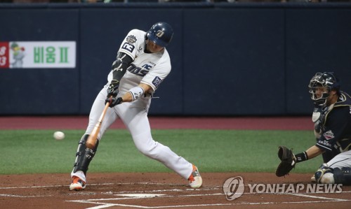 | ▲ '또 안타' (서울=연합뉴스) 한종찬 기자 = 17일 오후 서울 구로구 고척스카이돔에서 열린 2020 프로야구 포스트시즌 한국시리즈 1차전 두산 베어스와 NC 다이노스의 경기. 8회말 무사에서 NC 나성범이 2루타를 치고 있다. 2020.11.17 saba@yna.co.kr |