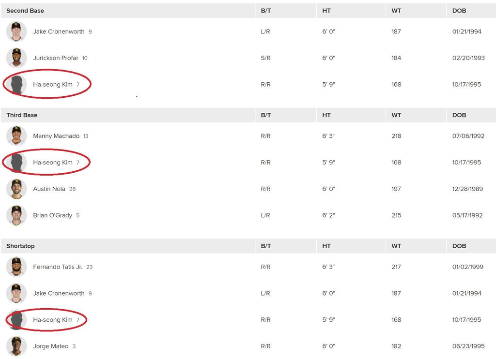 | ▲ MLB닷컴 샌디에이고 로스터 뎁스 차트 김하성(빨간색 타원)의 이름이 2루수, 3루수, 유격수 후보로 모두 올라 있다. 미국 언론은 김하성, 프로파르, 크로넨워스 등 샌디에이고 구단의 다기능 선수들에게 관심을 보였다. |