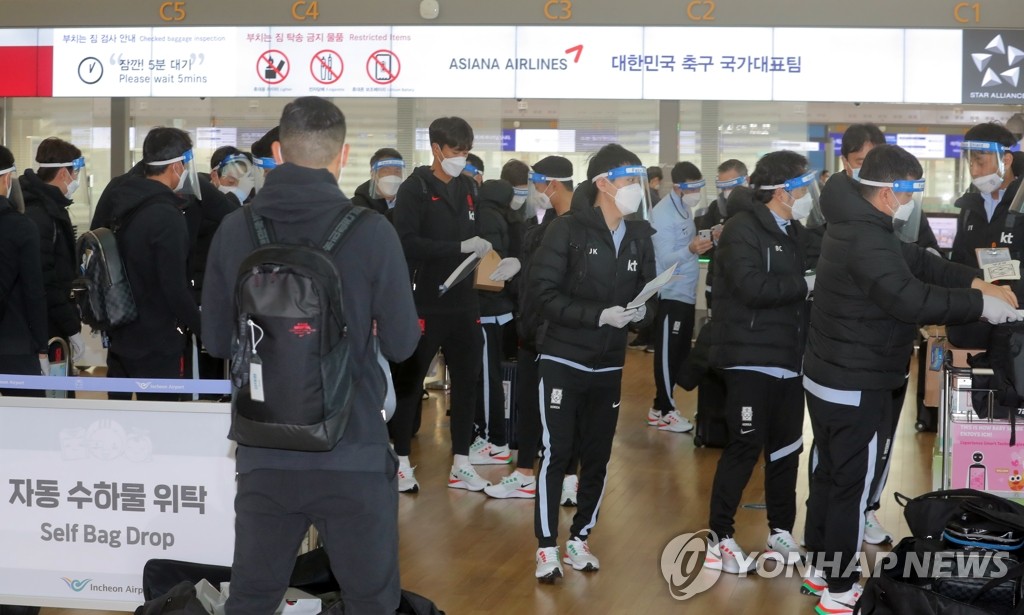| ▲ Members of the South Korean men's national football team, seen here wearing face shields at Incheon International Airport, west of Seoul, on March 22, 2021, prepare to depart for Japan for a friendly match in Yokohama. (Yonhap) |