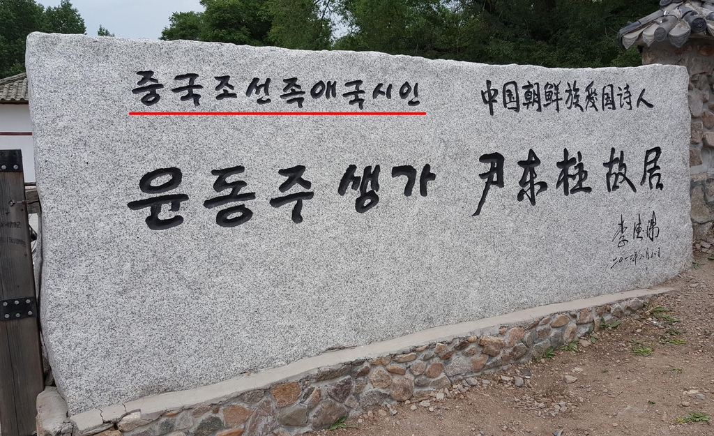 | ▲ 중국 윤동주 생가 입구 표석 중국 지린성 옌변조선족자치주 룽정 마을의 윤동주 생가 입구의 표석 문구. [서경덕 제공] |