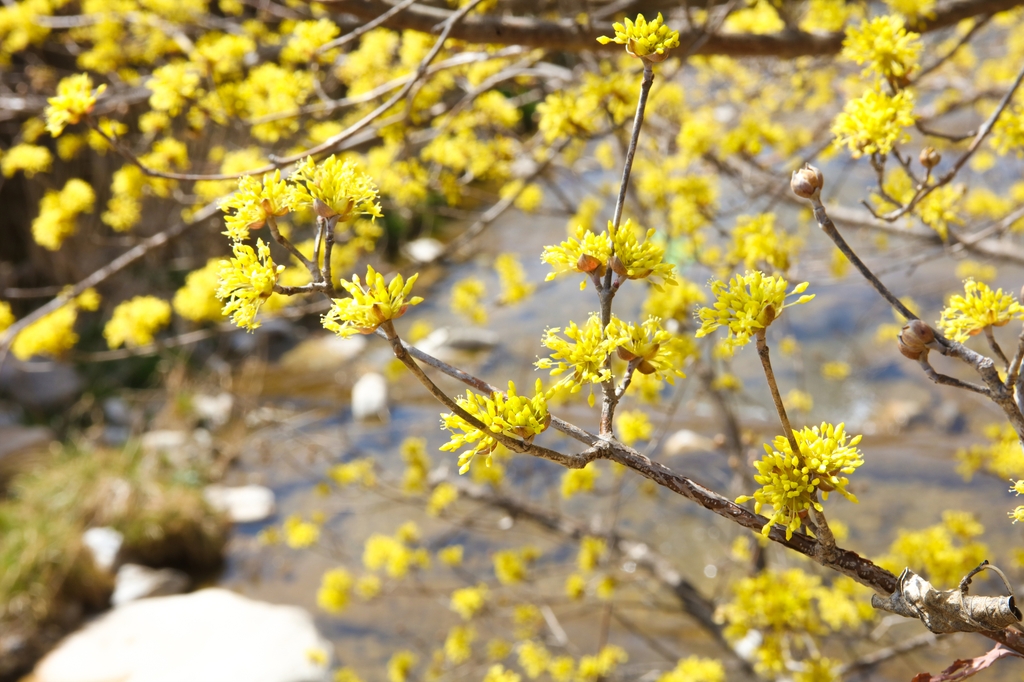 (단양=연합뉴스) 충북 단양군 가곡면 보발리마을 골짜기에 봄을 알리는 노란 산수유꽃이 활짝 피었다.