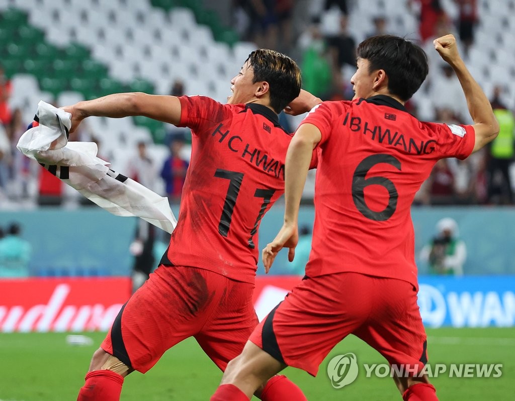 | ▲ 황희찬-황인범 승리 세리머니 (알라이얀=연합뉴스) 김도훈 기자 = 3일 오전(한국시간) 카타르 알라이얀의 에듀케이션 시티 스타디움에서 열린 2022 카타르 월드컵 조별리그 H조 3차전 대한민국과 포르투갈 경기가 끝난 뒤 역전 결승골을 넣은 황희찬이 황인범과 함께 팬들을 향해 세리머니를 하고 있다. 2022.12.3 superdoo82@yna.co.kr |