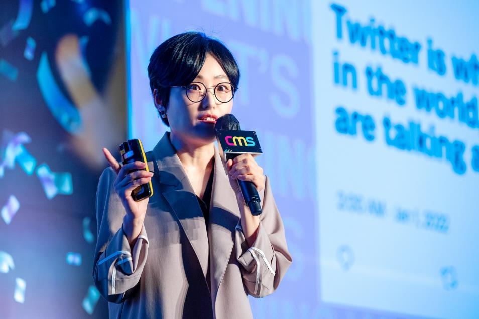 | ▲ This image provided by Twitter on Aug. 24, 2022, shows YeonJeong Kim, head of the global K-content partnership at Twitter, delivering a presentation at the Content Marketing Summit 2022 held in Seoul a day earlier. (PHOTO NOT FOR SALE) (Yonhap) |