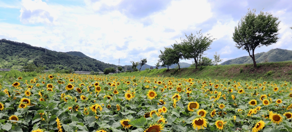 (옥천=연합뉴스) 충북 옥천군 청성면 보청천 둔치가 3만 송이의 해바라기꽃으로 노랗게 물들었다.