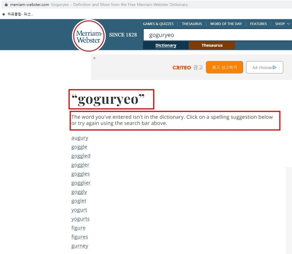 | ▲ 메리엄 웹스터에서 'goguryeo'를 검색하자 결과가 나타나지 않는다 [반크 제공] |