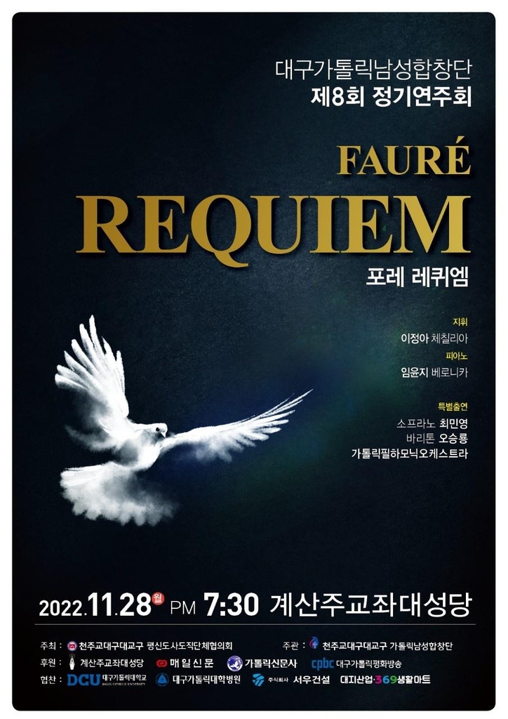 성우용 대구가톨릭 남성합창단 단장은 "힘겨운 삶을 살아가고 있는 이웃에게 위로와 평화를 구하는 기도가 되기를 바라는 마음으로 연주회를 준비했다"며 "연주회 테마인 레퀴엠을 통해 희생된 이들과 이웃에게 평화를 전하며 하루빨리 평화로운 세상이 되길 바란다"고 말했다.