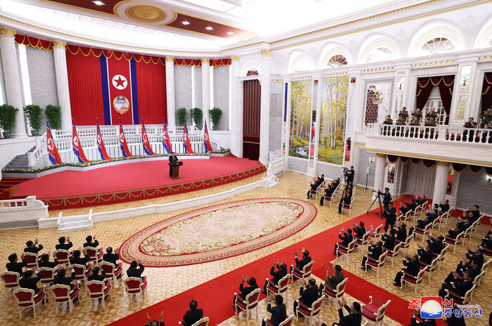 North Korean leader Kim Jong-un (on the podium)delivers a speech in Pyongyang on Sept. 9, 2024, on the occasion of North Korea's 76th birthday, in this photo provided by the North's official Korean Central News Agency. (For Use Only in the Republic of Korea. No Redistribution)