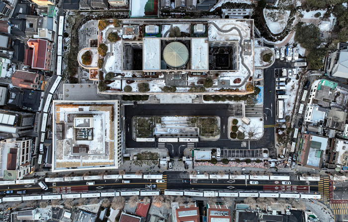 Barricades of police buses are seen near the Constitutional Court in Seoul on Feb. 13, 2025, as the court is set to hold the eighth hearing of detained President Yoon Suk Yeol's impeachment trial in connection with his short-lived imposition of martial law in December. (Yonhap)