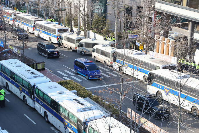A Ministry of Justice vehicle (blue) carrying arrested President Yoon Suk Yeol drives en route to the Seoul Central District Court in the capital on Feb. 20, 2025, as Yoon will attend the first hearing of his criminal trial on insurrection charges in connection with his short-lived imposition of martial law in December. (Yonhap)
