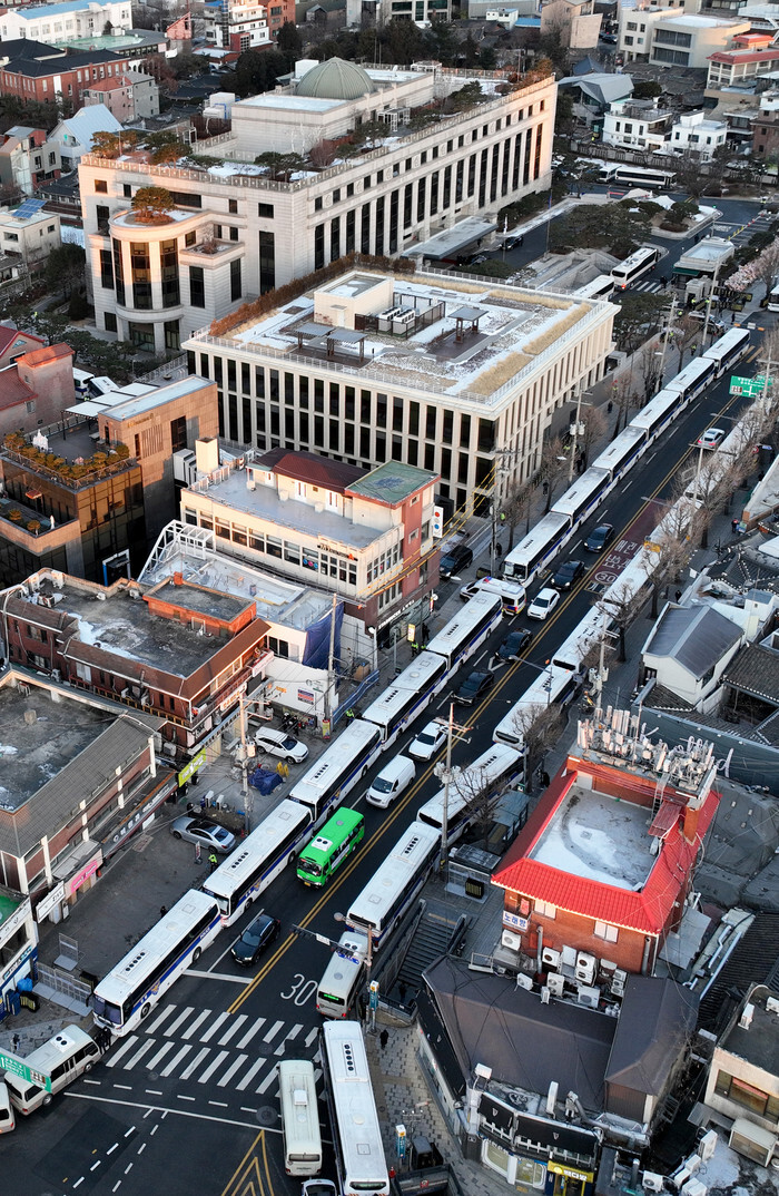 Barricades of police buses are seen near the Constitutional Court in Seoul on Feb. 13, 2025, as the court is set to hold the eighth hearing of detained President Yoon Suk Yeol's impeachment trial in connection with his short-lived imposition of martial law in December. (Yonhap)