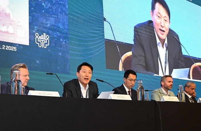 Seoul Mayor Oh Se-hoon (2nd from L) speaks during 14th Mayors Forum of the World Cities Summit in Vienna on July 3, 2025, in this photo released by the Seoul metropolitan government. (PHOTO NOT FOR SALE) (Yonhap)