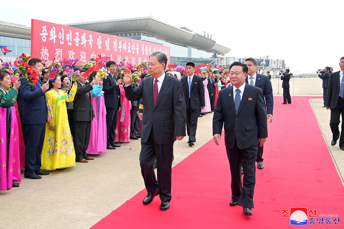 Zhao Leji (L), chairman of the standing committee of China's National People's Congress, greets people while under the escort of his North Korean counterpart, Choe Ryong-hae (R), upon arrival at Pyongyang Sunan International Airport on April 11, 2024, in this photo released by the North's Korean Central News Agency the subsequent day. Zhao visited Pyongyang at the North's invitation to celebrate the 75th anniversary of diplomatic ties between the two nations. (PHOTO NOT FOR SALE) (Yonhap)