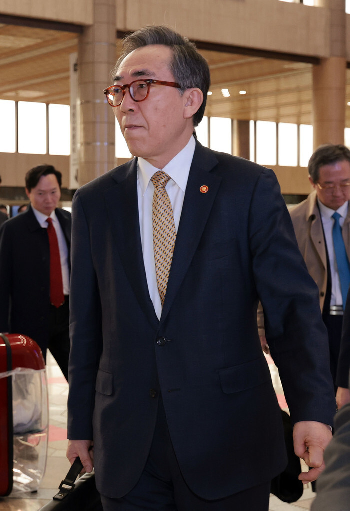 Foreign Minister Cho Tae-yul arrives at Seoul's Gimpo airport on March 21, 2025, before his departure for Tokyo to attend a trilateral meeting the next day with his Japanese and Chinese counterparts. (Yonhap)
