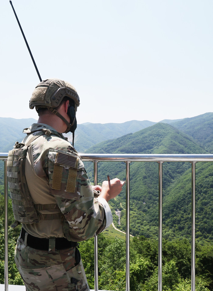 A U.S. special warfare soldier requests shelling from a U.S. AC-130J Ghostrider during the gunship's live-fire drill over a firing range in Taebaek, 181 kilometers southeast of Seoul, on June 18, 2024. (Yonhap)