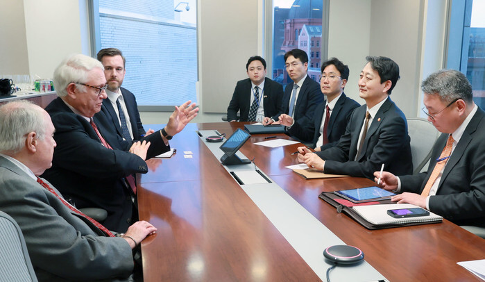 South Korean Industry and Trade Minister Ahn Duk-geun (2nd from R) talks with John Hamre (2nd from L), president of the Center for Strategic and International Studies (CSIS), during their meeting in Washington on Feb. 27, 2025, in this photo released by the South Korean industry ministry. (PHOTO NOT FOR SALE) (Yonhap)