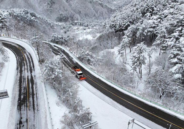 A snowplow clears snow from the road on Guryong Pass in Yangyang, South Korea's northeastern province of Gangwon, on March 17, 2025, following heavy snowfall overnight in the area. The province's mountainous region received 42.5 centimeters of snow over the past two days. (Yonhap)