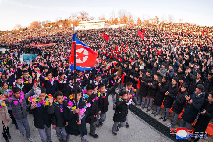 Graduates from middle schools in Pyongyang march at the Youth Park Open-Air Theatre in the North Korean capital on Feb. 26, 2025, during a rally to pledge to serve military duties at the Army's front-line units as part of efforts to defend their fatherland, in this photo released by the North's official Korean Central News Agency the next day. (For Use Only in the Republic of Korea. No Redistribution) (Yonhap)