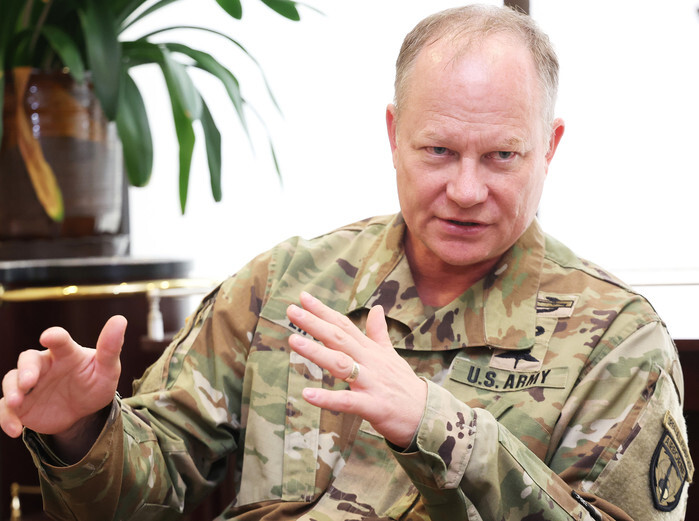 Brig. Gen. Derek Lipson, commander of the Special Operations Command Korea, speaks during an interview with Yonhap News Agency at Camp Humphreys in Pyeongtaek, 60 kilometers south of Seoul, on April 30, 2024. (Yonhap)