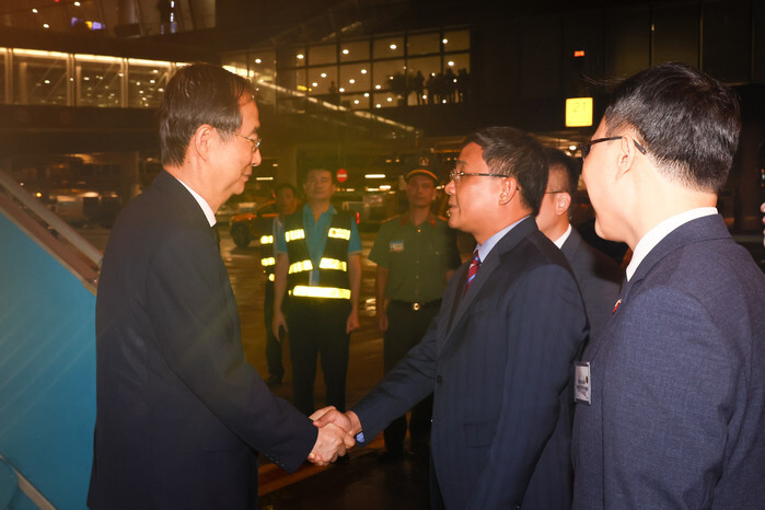 South Korean Prime Minister Han Duck-soo (L) is received by Vietnamese Deputy Foreign Minister Nguyen Minh Vu upon arrival at Noibai International Airport in Hanoi on July 24, 2024. Han will attend a state funeral of Nguyen Phu Trong, general secretary of the Communist Party of Vietnam. (Yonhap)