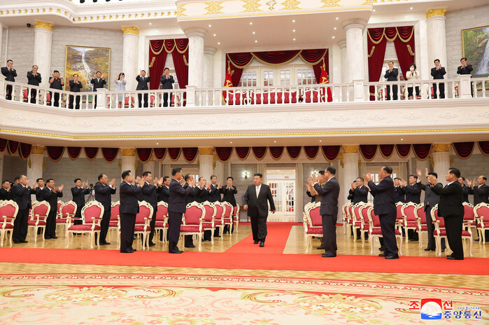 North Korean leader Kim Jong-un (C) enters to deliver a speech in Pyongyang on Sept. 9, 2024, on the occasion of North Korea's 76th birthday, in this photo provided by the North's official Korean Central News Agency. (For Use Only in the Republic of Korea. No Redistribution) (Yonhap)