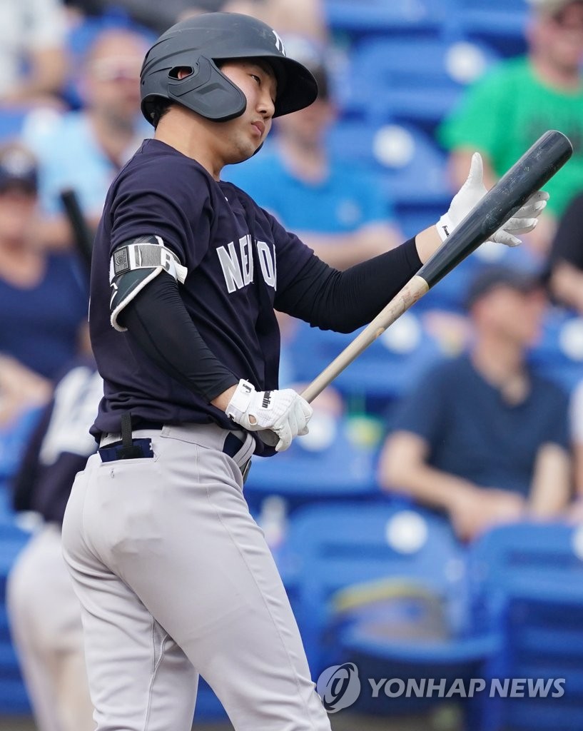 | ▲ In this file photo from Feb. 25, 2020, Park Hoy-jun of the New York Yankees reacts to a strikeout against the Toronto Blue Jays in a spring training game at TD Ballpark in Dunedin, Florida. (Yonhap) |