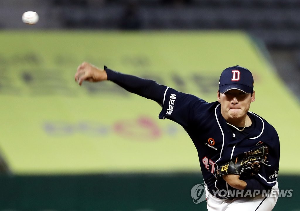 | ▲  Gwak Been of the Doosan Bears pitches against the SSG Landers during the bottom of the first inning of a Korea Baseball Organization regular season game at Incheon SSG Landers Field in Incheon, some 40 kilometers west of Seoul, on Oct. 28, 2021. (Yonhap) |