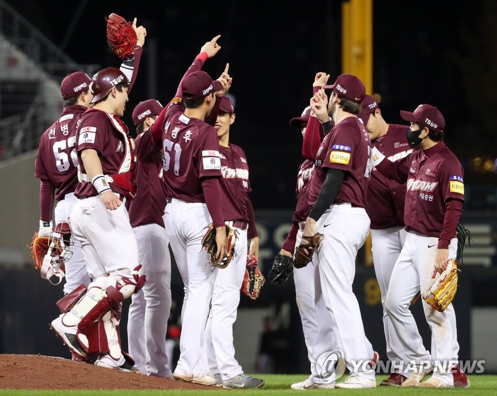 | ▲  Kiwoom Heroes' players celebrate their 6-1 victory over the Kia Tigers in a Korea Baseball Organization regular season game at Gwangju-Kia Champions Field in Gwangju, 330 kilometers south of Seoul, on Oct. 30, 2021. (Yonhap) |