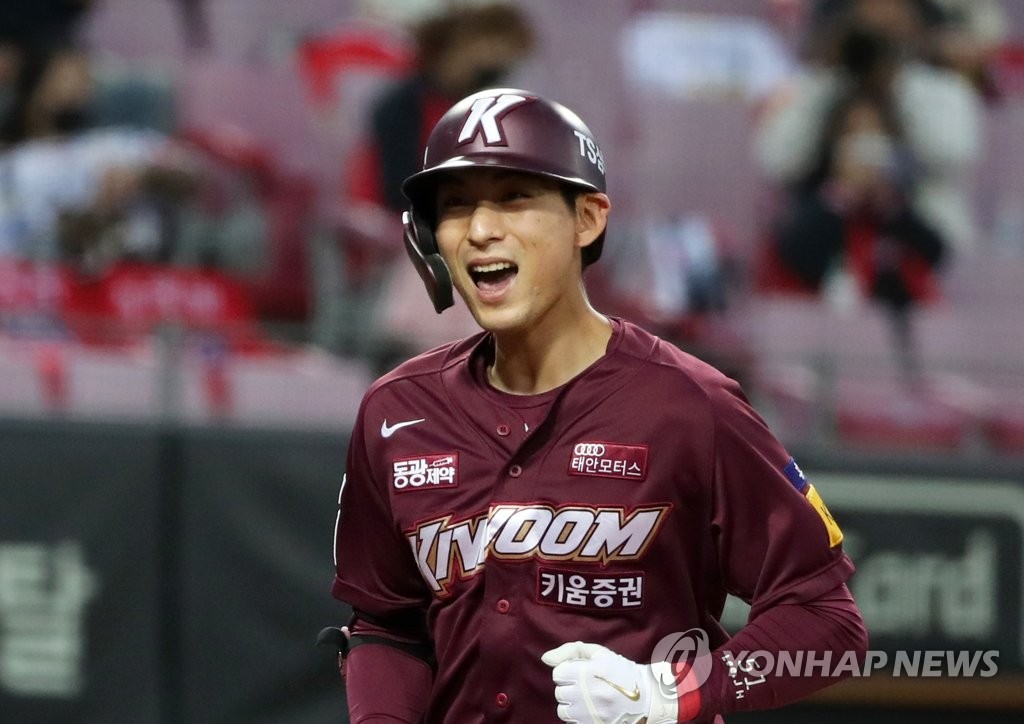 | ▲  Lee Jung-hoo of the Kiwoom Heroes celebrates his solo home run against the Kia Tigers during the top of the second inning of a Korea Baseball Organization regular season game at Gwangju-Kia Champions Field in Gwangju, 330 kilometers south of Seoul, on Oct. 30, 2021. (Yonhap) |