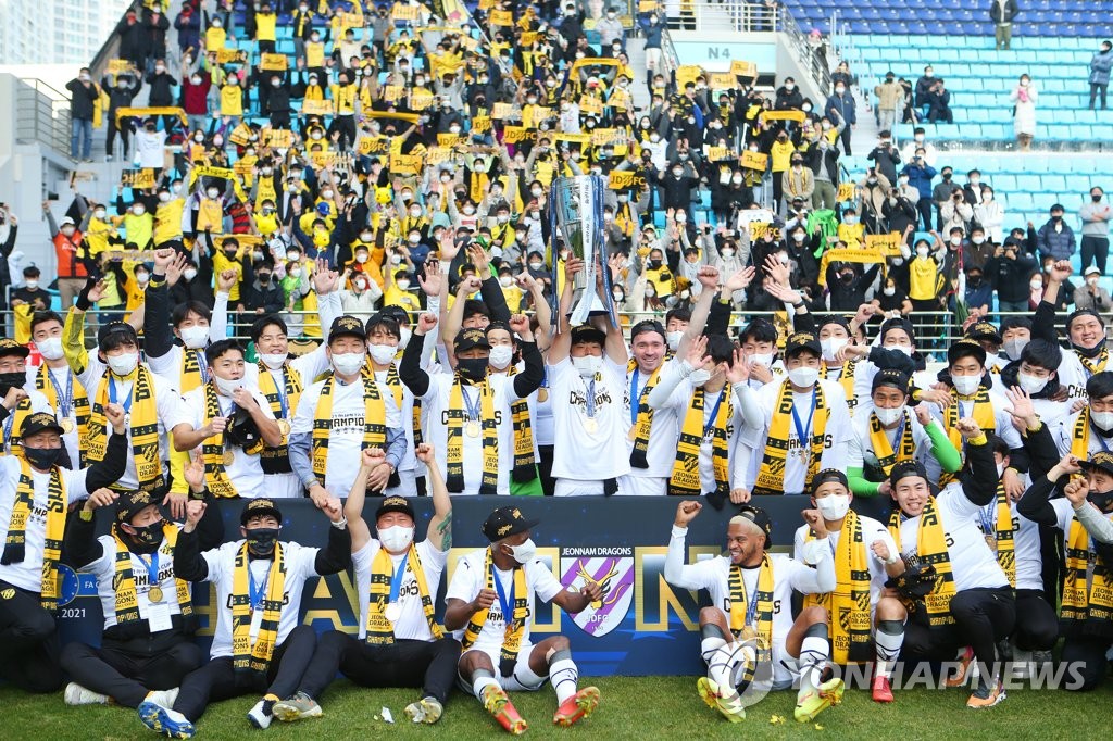 | ▲  In this file photo from Dec. 11, 2021, members of Jeonnam Dragons celebrate after winning the FA Cup title over Daegu FC at DGB Daegu Bank Park in Daegu, 300 kilometers southeast of Seoul. (Yonhap) |