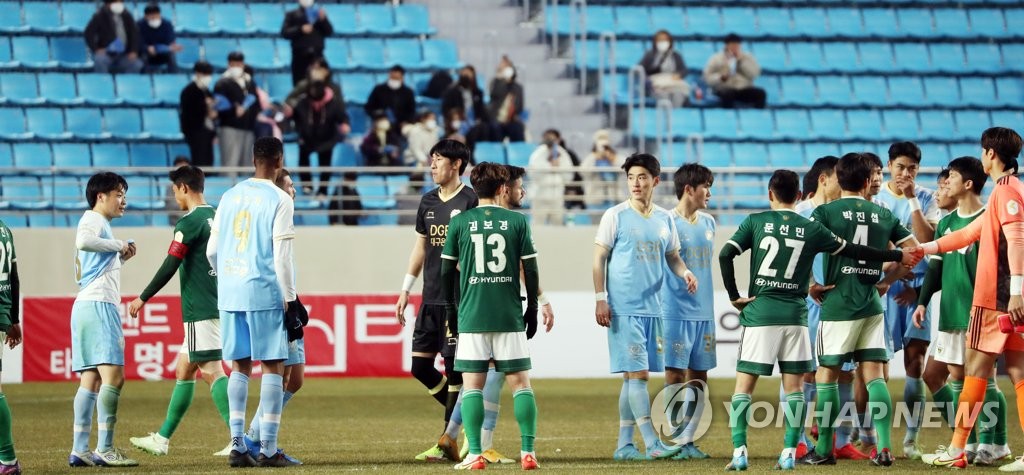 | ▲  In this file photo from Feb. 27, 2022, players for Daegu FC (in blue) and Jeonbuk Hyundai Motors acknowledge each other after a 1-1 draw in their K League 1 match at DGB Daegu Bank Park in Daegu, 300 kilometers southeast of Seoul. (Yonhap) |
