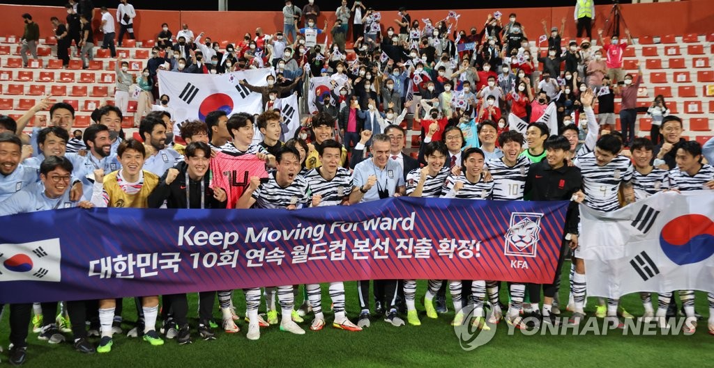 | ▲ '가자! 카타르로!' (두바이=연합뉴스) 김인철 기자 = 1일(현지시간) 아랍에미리트(UAE) 두바이의 라시드 스타디움에서 열린 2022 카타르 월드컵 아시아 최종예선 8차전 대한민국과 시리아의 경기에서 승리하며 10회 연속 및 통산 11번째 월드컵 본선 진출을 확정한 대한민국 축구대표팀이 환호하고 있다. 2022.2.2 yatoya@yna.co.kr |