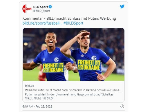 독일 타블로이드 일간 빌트는 앞서 '푸틴의 광고에 종지부를 찍는다'는 제목의 논평을 내고 "추후 공지가 있을 때까지 지면과 홈페이지에 실리는 우리 기사에서는 샬케 유니폼 셔츠에 가즈프롬 로고 대신 '우크라이나에 자유를'이라는 문구를 붙여 사용한다"고 알리기도 했다.