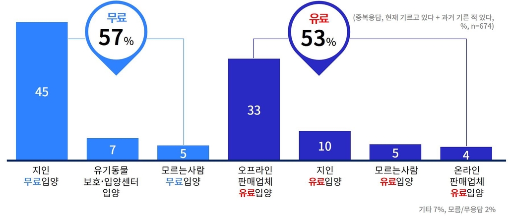 '입양경로'를 묻는 항목(중복 응답)에 응답자의 57%는 지인 무료(45%), 유기 동물 보호·입양센터(7%), 모르는 사람 무료(5%) 등 '무상 경로'를 꼽았다.