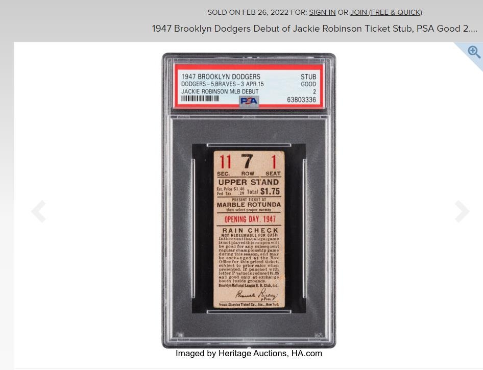 미국 스포츠전문매체 ESPN은 28일(이하 한국시간) 헤리티지 옥션스가 진행한 경매에서 1947년 브루클린 다저스 소속의 로빈슨 데뷔전 입장권 반쪽이 48만달러(약 5억7천500만원)에 팔렸다고 전했다.
