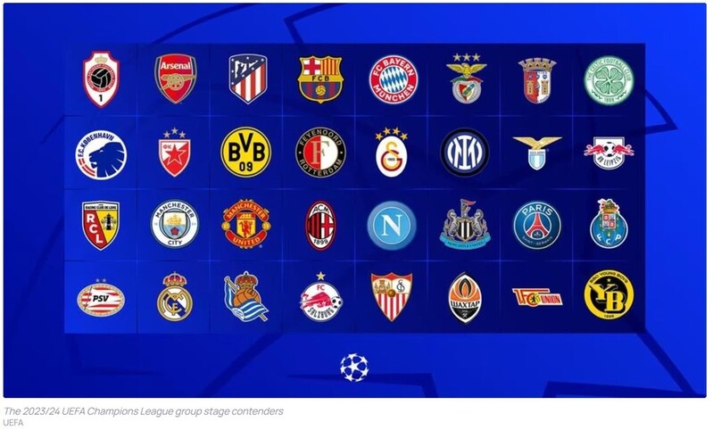 | ▲ 2023-2024 UEFA 챔피언스리그 본선 조별리그 진출 32개팀 [UEFA 홈페이지 캡처. 재판매 및 DB 금지] |