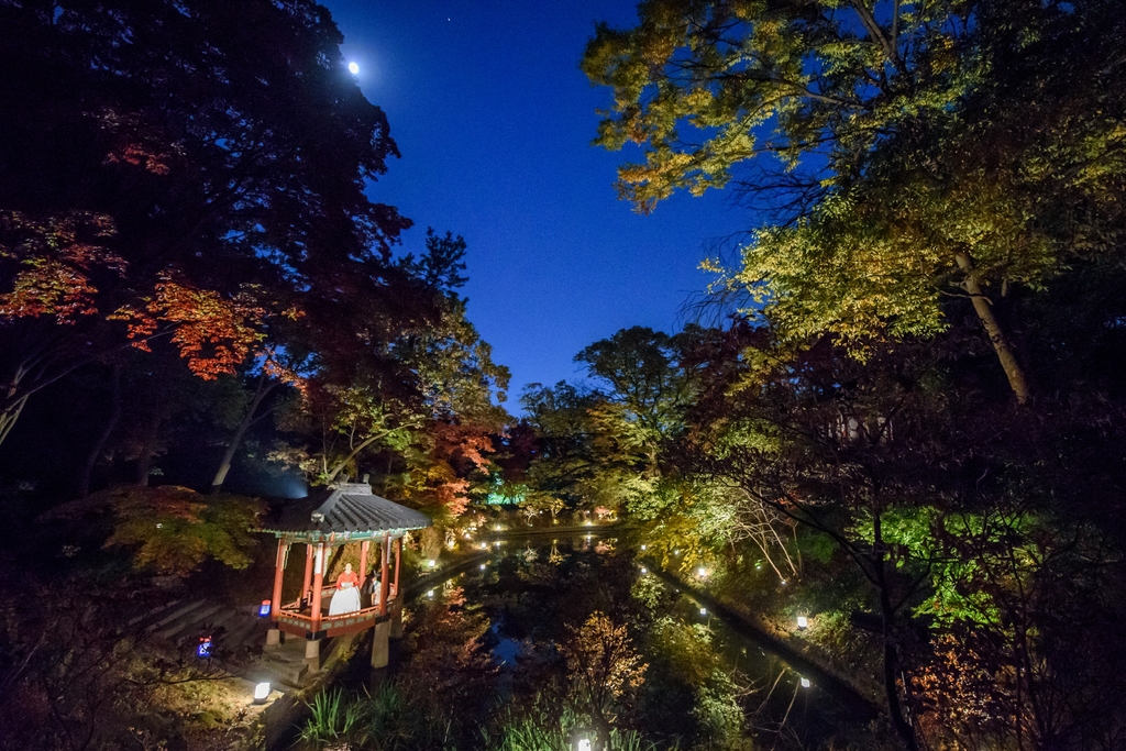 달빛기행의 묘미인 부용지와 주합루의 풍경을 배경으로 국왕과 왕비로 치장한 재연배우가 후원을 산책하는 모습도 볼 수 있다.