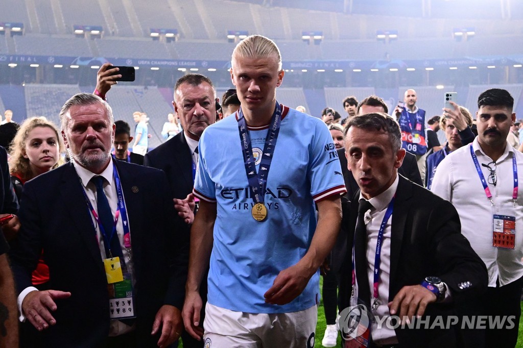 (서울=연합뉴스) 안홍석 기자 = '괴물 골잡이' 엘링 홀란(22)이 맨체스터 시티(맨시티)의 첫 '유럽 트레블' 달성에 앞장서고 '득점 2관왕'까지 거머쥐며 충격의 잉글랜드 프로축구 프리미어리그(EPL) 데뷔 시즌을 마쳤다.