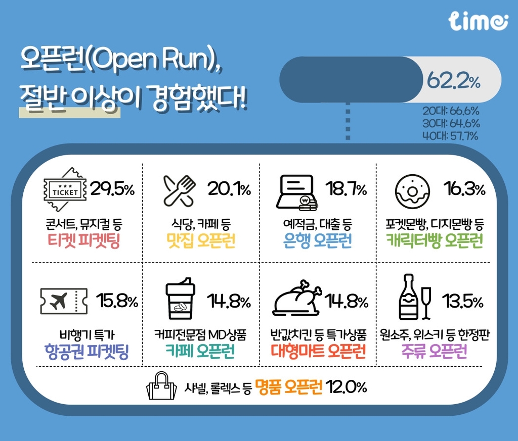 오픈런을 해봤다는 응답은 62.2%였는데 20대(66.6%), 30대(64.6%), 40대(57.7%) 순으로 많았다.
