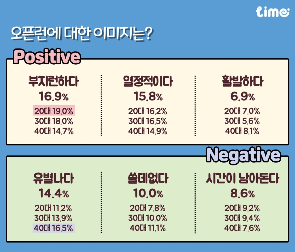 20·30 세대는 오픈런에 대해 '부지런하다', '열정적이다'처럼 긍정적으로 생각하는 경우가 많았지만, 오픈런을 해보지 않은 사람들은 유별나다(18.4%), 쓸데없다(13.8%) 등 부정적 이미지를 가지고 있기도 했다.