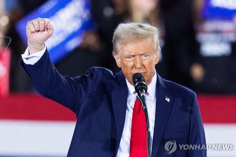 | ▲ Former U.S. President Donald Trump raises his fist as he speaks during a campaign rally at J.S. Dorton Arena in Raleigh, North Carolina, on Nov. 4, 2024, in this photo released by AFP. (Yonhap) |
