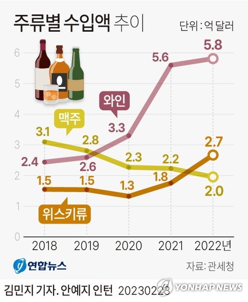 | ▲ [그래픽] 주류별 수입액 추이 (서울=연합뉴스) 김민지 기자 minfo@yna.co.kr