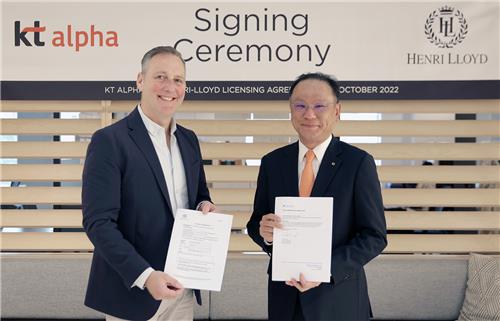 | ▲ KT알파 쇼핑, 영국 패션브랜드 헨리로이드와 라이선스 계약 (서울=연합뉴스) KT알파 쇼핑은 영국 패션 브랜드 '헨리로이드'(HENRI-LLOYD)와 라이선스 계약을 체결했다고 8일 밝혔다. 사진 왼쪽부터 그레이엄 앨런 헨리로이드 회장, 조성수 KT알파 경영기획총괄 전무. 2022. 11. 8 [KT알파 쇼핑 제공. 재판매 및 DB 금지] |
