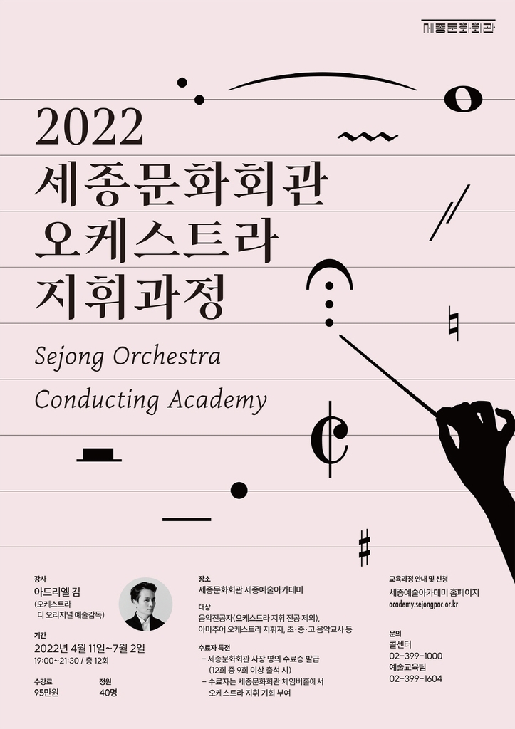▲ 세종문화회관이 세종예술아카데미 '2022 오케스트라 지휘과정' 참가자를 모집한다. '오케스트라 지휘과정'은 음악가 및 전공자, 아마추어 지휘자에게 지휘 경험을 제공하기 위해 2015년 시작했다. 다음 달 11일부터 7월 2일까지 총 12회로 진행되는 이번 강좌는 지휘 기초 테크닉, 스코어 리딩, 앙상블 및 오케스트라 실습 등으로 구성된다. 오케스트라 디 오리지널 예술감독인 아드리엘 김이 강사로 나선다. 세종예술아카데미 홈페이지(https://academy.sejongpac.or.kr/)와 세종문화회관 티켓(☎ 02-399-1000)에서 선착순 모집한다. 자세한 내용은 세종예술아카데미 홈페이지 참고. (서울=연합뉴스)