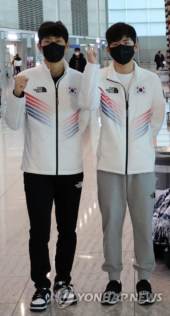 | ▲ South Korean speed skaters Lee Seung-hoon (L) and Chung Jae-won pose for photos at Incheon International Airport in Incheon, just west of Seoul, on Feb. 3, 2022, before departing for Beijing for the 2022 Winter Olympics. (Yonhap) |