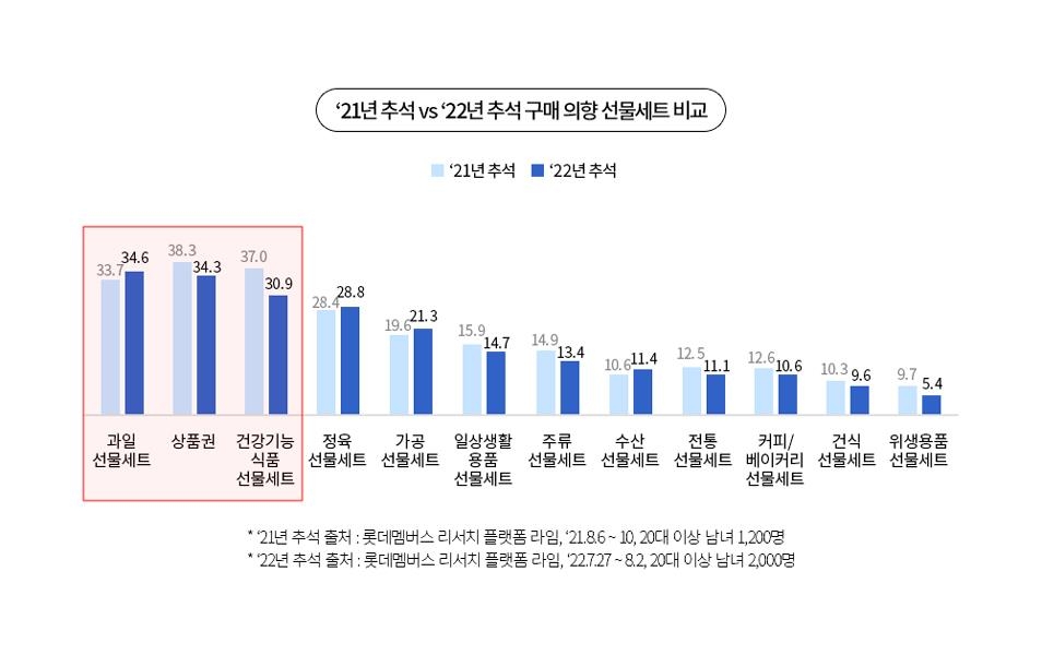 선물 개수와 가격대를 늘리겠다는 답변은 사회적 거리두기 해제로 오랜만에 친척들과 모이는 사람들이 많아졌기 때문으로 롯데멤버스는 분석했다.