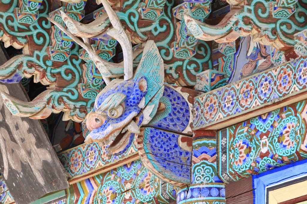 기둥 위에는 용머리 조각이, 천장 위에는 용머리 장식 등이 해학적이면서도 섬세하게 표현돼 있다.
