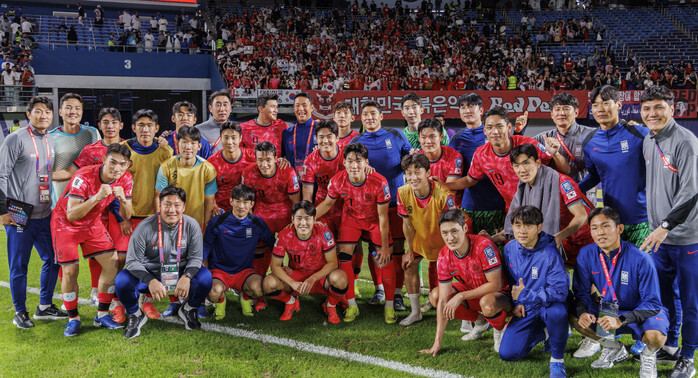 South Korean players and coaches pose for group photos after beating Kuwait 3-1 in the teams' Group B match in the third round of the Asian World Cup qualification at Jaber Al-Ahmad International Stadium in Kuwait City on Nov. 14, 2024. (Yonhap)
