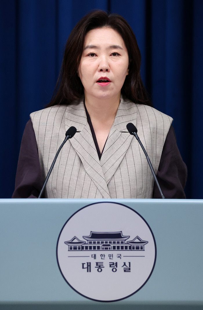 Presidential spokesperson Presidential spokesperson Kang Yu-jung attends a press conference at the presidential office in Seoul on Aug. 15, 2025. (Yonhap)(END)