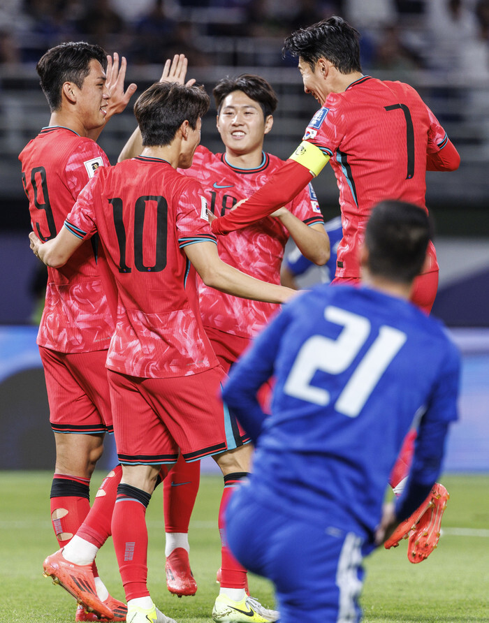 Oh Se-hun of South Korea (L) reacts after scoring a header over Hasan Hamdan of Kuwait during the teams' Group B match in the third round of the Asian World Cup qualification at Jaber Al-Ahmad International Stadium in Kuwait City on Nov. 14, 2024. South Korea trounced Kuwait 3-1. (Yonhap)