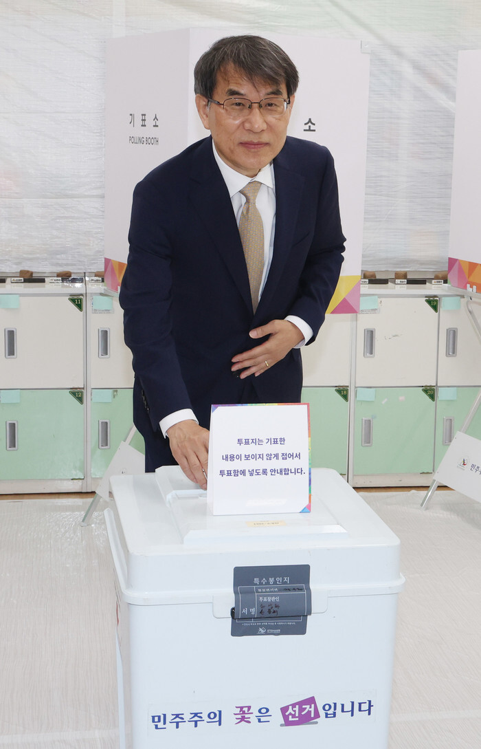 Rho Tae-ak, head of the National Election Commission, casts his ballot in the presidential election at a polling station in Seoul's Seocho Ward on June 3, 2025. (Yonhap)